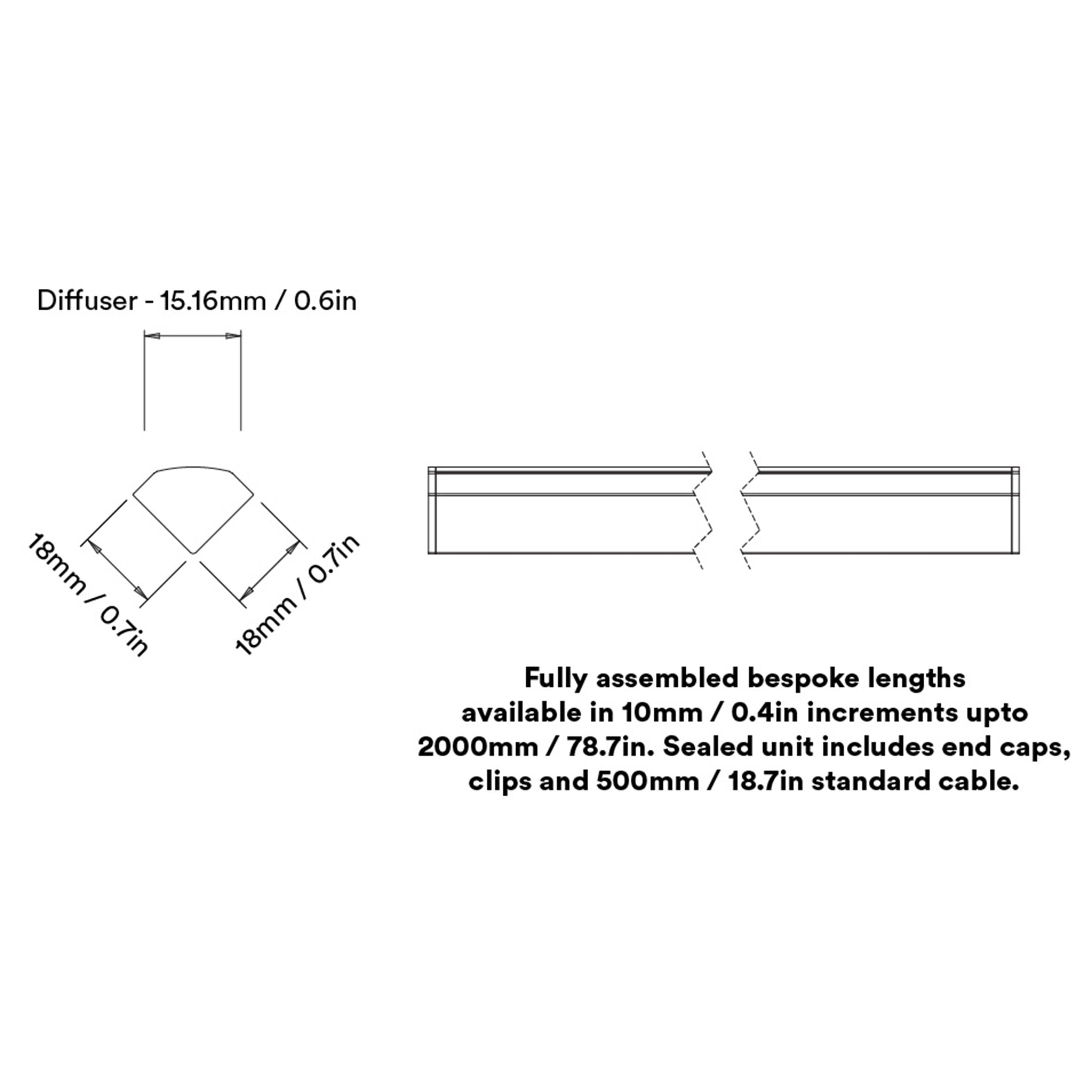 Kit includes - RAL9010 profile, diffuser, LED strip, end caps, fixing clips and 300mm lead at each end.