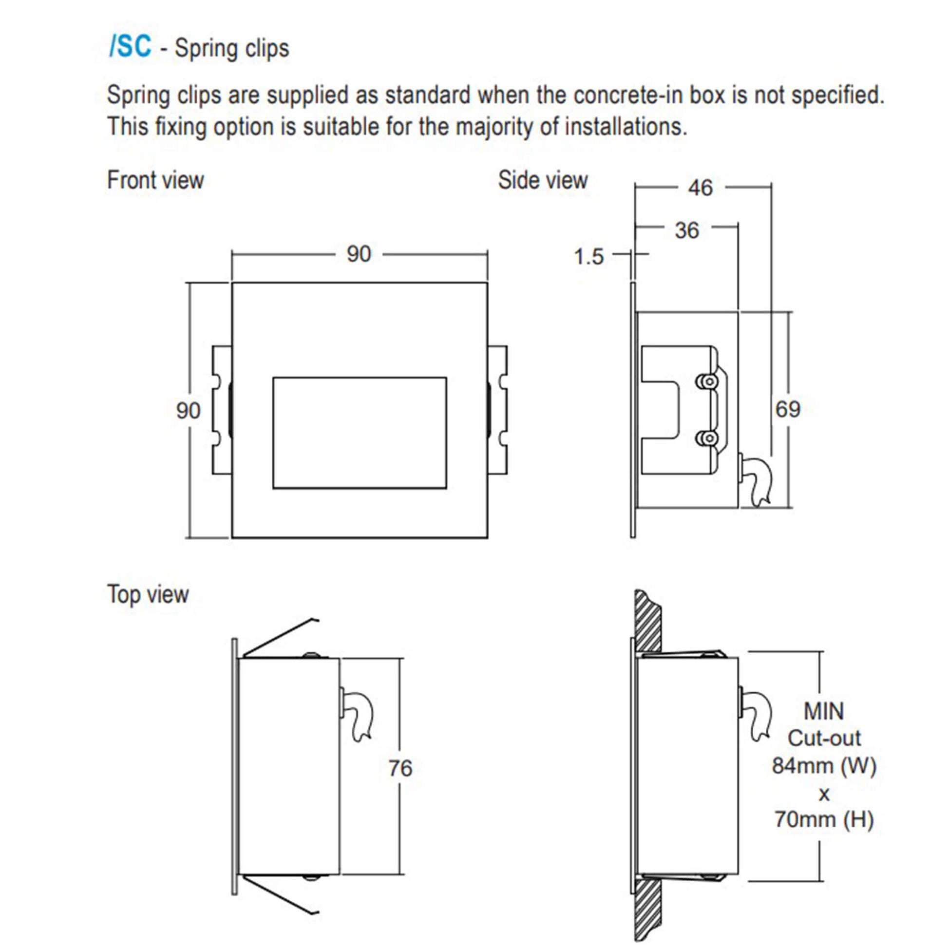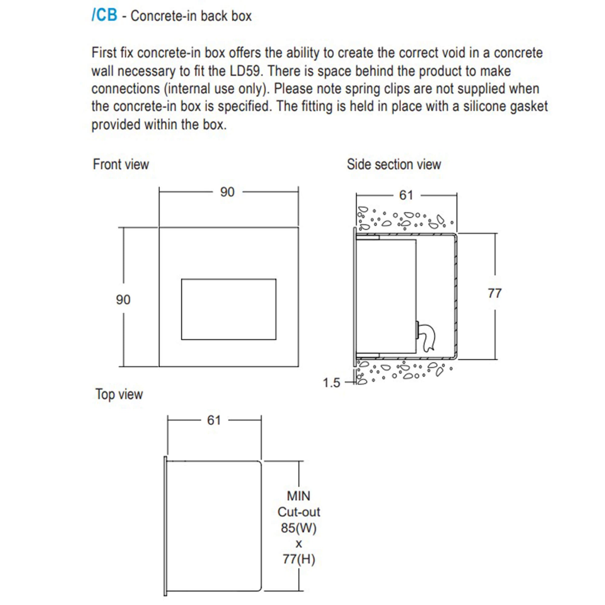 Supplied with spring clips as standard or a first fix concrete-in box offering the ability to create the correct void in a concrete wall necessary to fit the LD59.